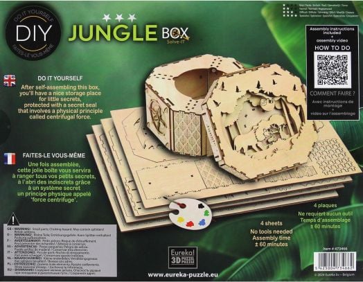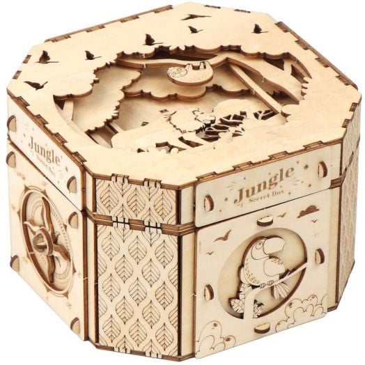 Логическият дървен 3D пъзел „Джунгла“ на Eureka съчетава забавление, логическо мислене и креативност в едно оригинално изживяване. След сглобяването си пъзелът се превръща в стилна кутийка за съхранение на малки предмети, оборудвана със секретна ключалка с иновативен механизъм, базиран на центробежна сила.