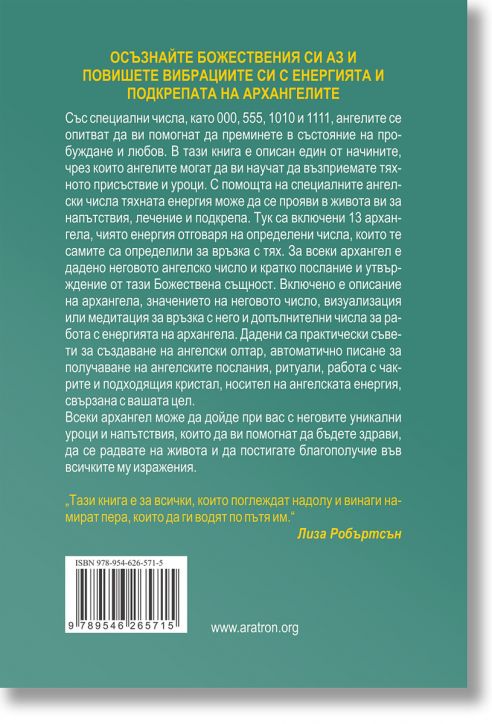 В тази книга е описан един от начините, чрез които ангелите могат да ви научат да възприемате тяхното присъствие и уроци. С помощта на специалните ангелски числа тяхната енергия може да се прояви в живота ви за напътствия, лечение и подкрепа.