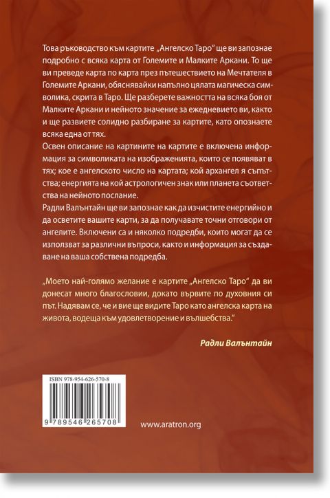 Това ръководство към картите „Ангелско Таро“ ще ви запознае подробно с всяка карта от Големите и Малките Аркани. То ще ви преведе карта по карта през пътешествието на Мечтателя в Големите Аркани, обяснявайки напълно цялата магическа символика, скрита в Таро. Ще разберете важността на всяка боя от Малките Аркани и нейното значение за ежедневието ви, както и ще развиете солидно разбиране за картите, като опознаете всяка една от тях.