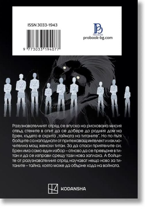 Разузнавателният отряд се впуска на рискована мисия отвъд стените в опит да се добере до родния дом на Ерен, където е скрита „тайната на титаните“. Но по пътя бойците са нападнати от притежаващ интелект и изключителна мощ женски титан. За да спаси приятелите си, Ерен има само един избор – отново да се превърне в титан и да се изправи срещу тази нова заплаха. А бойците от разузнавателния отряд научават нещо ново за титаните – тайна, която може да обърне хода на войната.