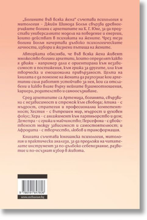 „Богините във всяка жена“ съчетава психология и митология – Джийн Шинода Болън свързва древногръцките богини с архетипите на К. Г. Юнг, за да представи универсалните модели на поведение и енергии, които действат в психиката на жените. Чрез тези богини Болън начертава дълбоко психологическите личности, избори и жизнени пътища на жените.