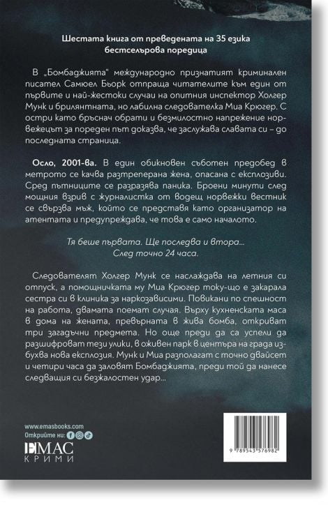 В „Бомбаджията“ Самюел Бьорк отпраща читателите към един от първите и най-жестоки случаи на опитния инспектор Холгер Мунк и брилянтната, но лабилна следователка Миа Крюгер.
