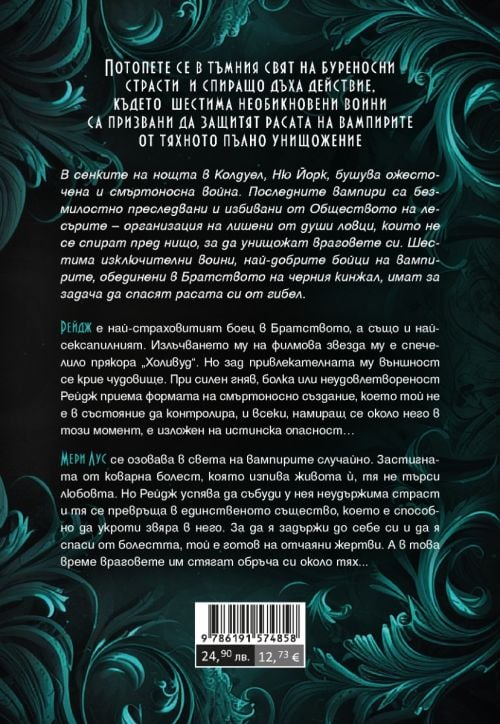 Мери Лус се озовава в света на вампирите случайно. Застигната от коварна болест, която изпива живота ѝ, тя не търси любовта. Но Рейдж успява да събуди у нея неудържима страст и тя се превръща в единственото същество, което е способно да укроти звяра в него. За да я задържи до себе си и да я спаси от болестта, той е готов на отчаяни жертви. А в това време враговете им стягат обръча си около тях...