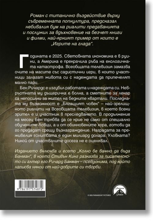 Роман с титанично въздействие върху съвременната попкултура, предсказал небивалия бум на риалити предаванията и послужил за вдъхновение на безчет книги и филми, най-яркият пример от които е „Игрите на глада“.