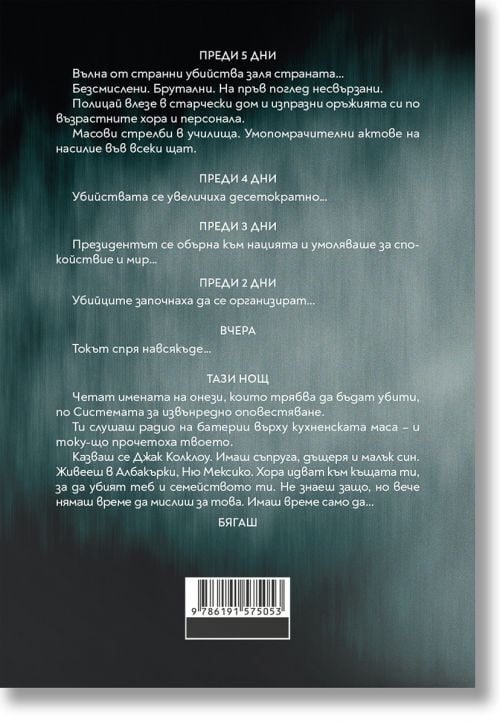 Четат имената на онези, които трябва да бъдат убити, по Системата за извънредно оповестяване. Ти слушаш радио на батерии върху кухненската маса – и току-що прочетоха твоето. Казваш се Джак Колклоу. Имаш съпруга, дъщеря и малък син. Живееш в Албакърки, Ню Мексико. Хора идват към къщата ти, за да убият теб и семейството ти. Не знаеш защо, но вече нямаш време да мислиш за това. Имаш време само да…