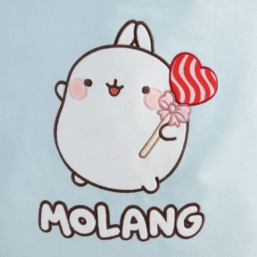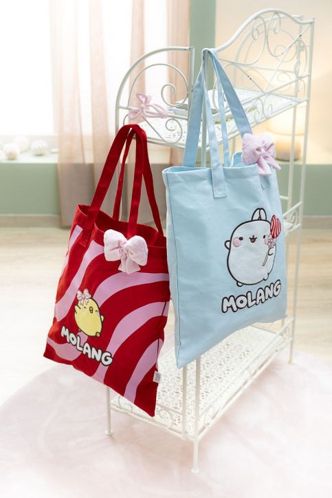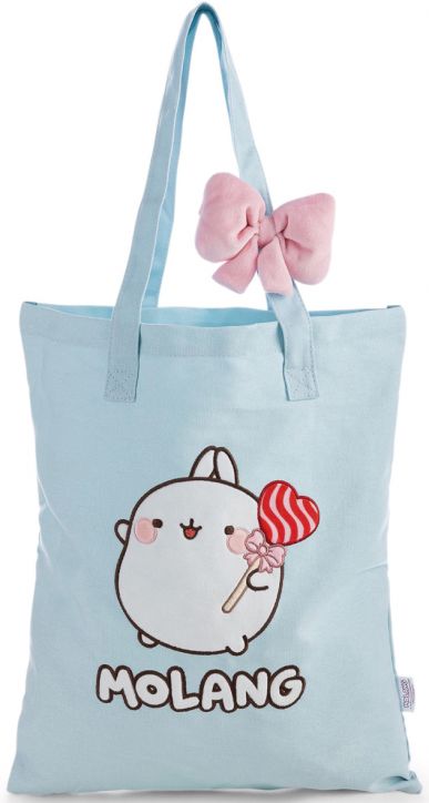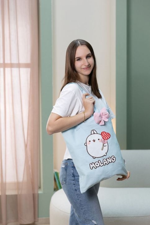 Търсиш практична и едновременно стилна чанта за ежедневието? Тази светлосиня памучна tote чанта с Molang и неговата сърцевидна близалка е точно попадение. Деликатната розова плюшена панделка в края на дръжката добавя чар и я превръща в истински акцент.
