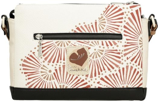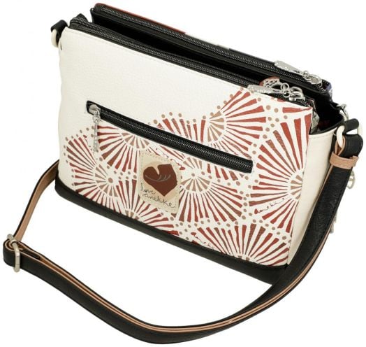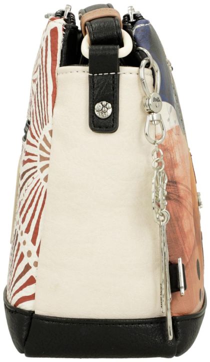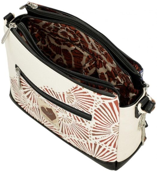Тази дамска чанта през рамо със средно към по-голям размер се затваря с цип и предлага практична организация. Моделът разполага с три отделни отделения, подплатена вътрешност с джобове и допълнителен външен джоб на гърба.