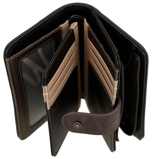 задна част с капак и тик-так закопчаване, включваща множество отделения за карти и банкноти