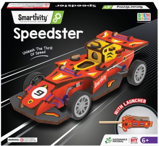 Със Smartivity Speedster децата не просто играят — те строят, експериментират и създават свой собствен състезателен автомобил! Комплектът позволява на малките инженери първо да сглобят дървения болид и неговия механичен стартер, а след това да го изстрелят и да наблюдават как се стрелка по пода. Кой ще стане шампионът на пистата?