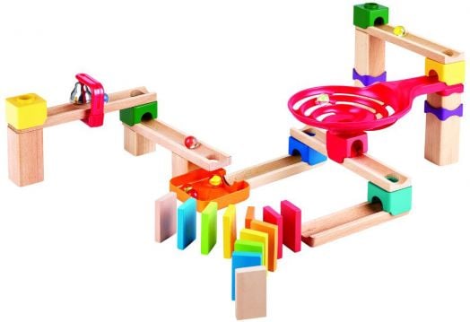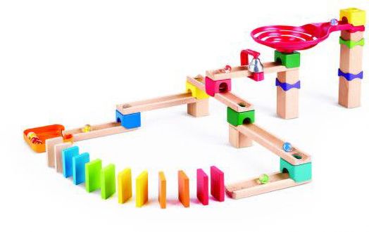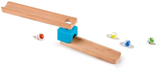 Комплектът представлява DIY писта за топчета, включваща блокове, писти, топчета и всички необходими части за създаване на разнообразни конструкции.