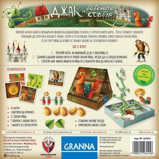 Няколко малки бобчета преобърнали живота на бедния Джак. Всичко се случило много бързо... Той се справил с опасното изкачване до скрития в облаците замък. Скрил се от великана. Намерил кокошка, която снасяла златни яйца. А сега той трябва да избяга от замъка заедно със златоносната кокошка!