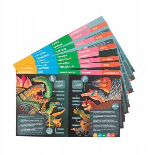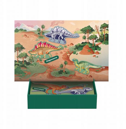 Комплектът представя едни от най-популярните динозаври, техните скелети и латинските им наименования.