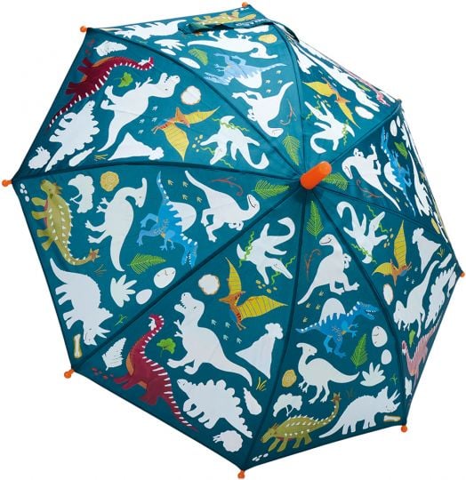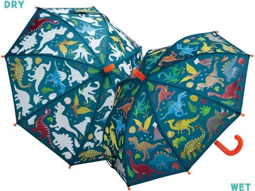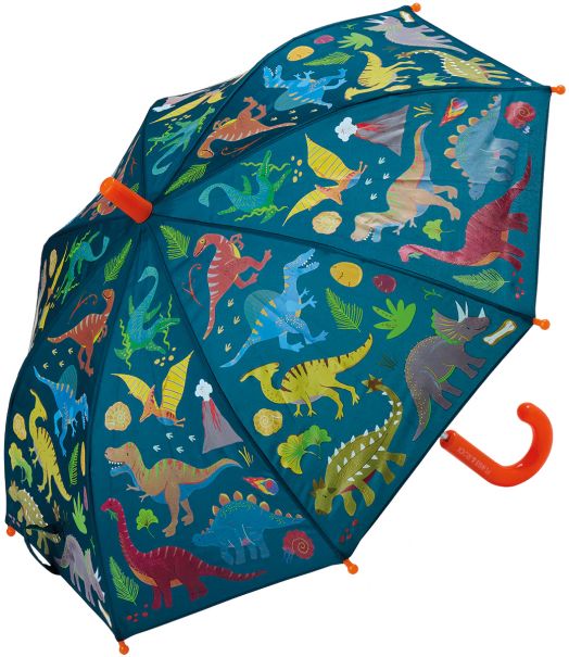 Този пъстър дизайн включва някои от любимите ни динозавърски приятели — гледай как се появяват „като по магия“, когато чадърът се намокри. Дъждът моментално се превръща в забавление.