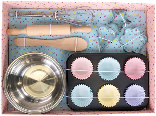 Комплектът включва информативна книжка с рецепти, 3 формички за сладки, точилка, бъркалка, лъжица за смесване, купа и 24 хартиени форми/кошнички за мъфини.