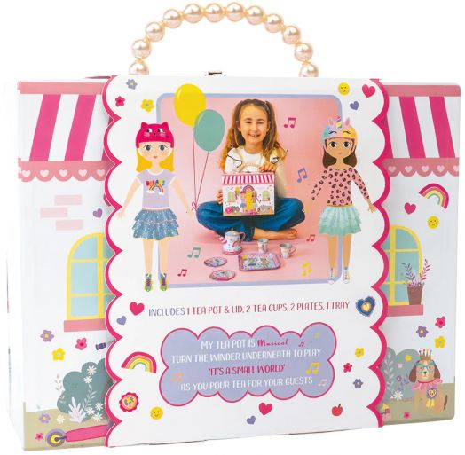 Комплектът включва чайник с капак, 2 чаши, 2 чинии и 1 поднос, всички прибрани в красива многократна кутия с удобна перлена дръжка – перфектна за разходки до чаените партита с приятели.