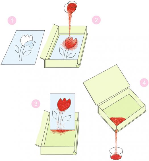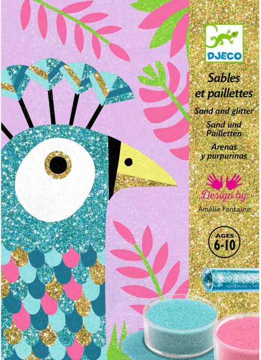 За да не се хаби цветният пясък, препоръчваме поръсването му да става над кутията на творческия комплект, която е създадена именно с тази цел. И за да се убедите, че експертите от "Djeco" са измислили всичко до последния детайл, в долния десен ъгъл на кутията ще откриете малък процеп. При накланяне на кутията, през него може да се изсипе останалия пясък обратно в бурканчето, за да не бъде изхабен напразно.