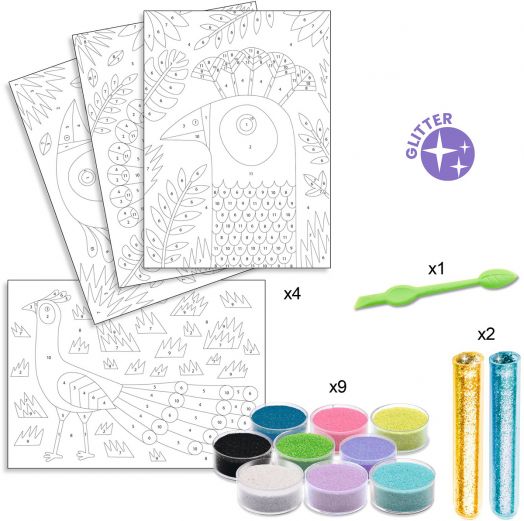 Комплектът "Блестящи пауни" съдържа 4 картички с изображения на красиви пауни, 9 бурканчета с различни цветове пясък, 2 епруветки с цветен брокат, инструмент и инструкции за употреба. Четирите картички са специални - те се състоят от 2 слоя, като долният е покрит с лепило, а горният представлява фолио. Т