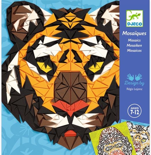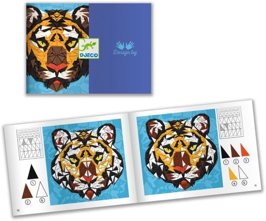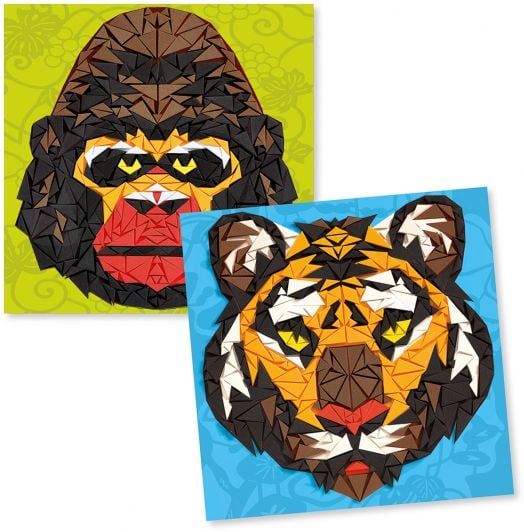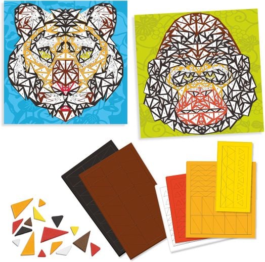 Създайте зашеметяващи мозайки от маймуни и тигри. С търпение и внимание децата сглобяват триъгълните парчета самозалепваща се пяна, за да пресъздадат животинските изображения.