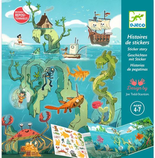 Чудесен комплект, обещаващ много забавления! Той е идеален за занимания дори и по време на път, като разполага с две панорамни картини с дължина 44 см., които се разгъват и илюстрират дълбините на морето.