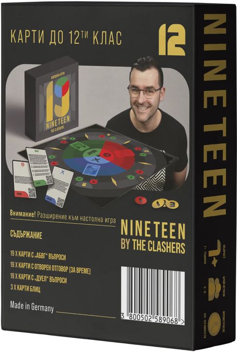 Това разширение за настолната игра Nineteen (By the Clashers) е подходящо за ученици до 12-ти клас и фенове на The Clashers, като добавя нови карти с въпроси към базовата игра. То запазва динамиката и ангажираността на оригиналната игра, и стимулира мисленето, знанията и бързата реакция на участниците, като същевременно осигурява забавление за цялото семейство. Разширението обогатява игровия опит с нови предизвикателства, адаптирани към възрастта и знанията на учениците до 12-ти клас.