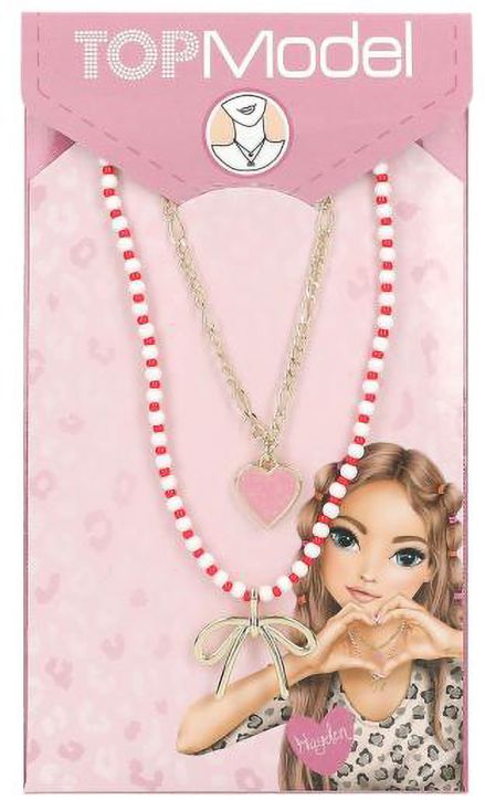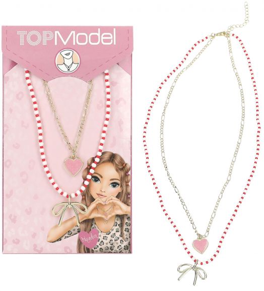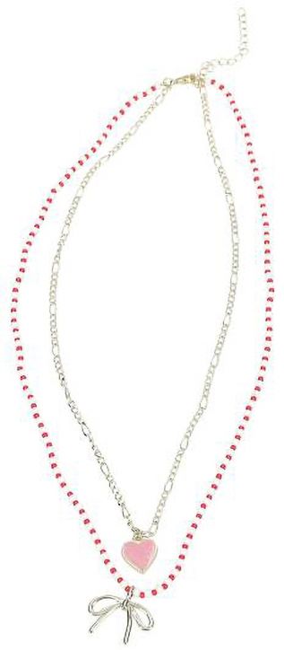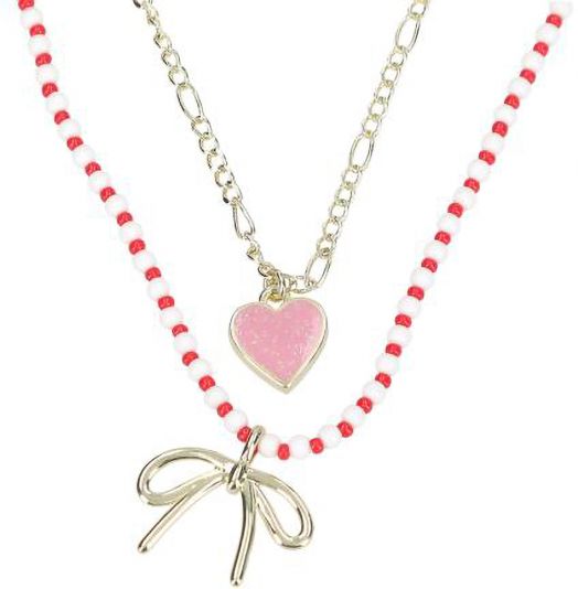 Двойно по-красиво! Двойното колие се състои от по-късо златисто колие с розово блестящо сърце и по-дълго колие от бели и червени мъниста със златна висулка с панделка.
