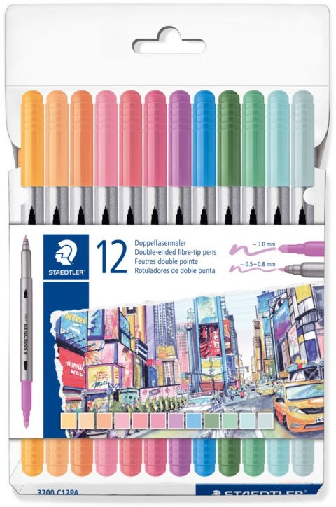 Двувърхи флумастери Staedtler 3200 в 12 пастелни цвята, подходящи за скициране, рисуване, писане и оцветяване