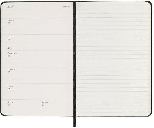 Организирането на дните от седмицата е на лявата страница в хоризонтален изглед, а дясна страница е линирана - с широки редове, което я прави подходяща за бележки и коментари.