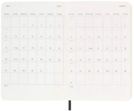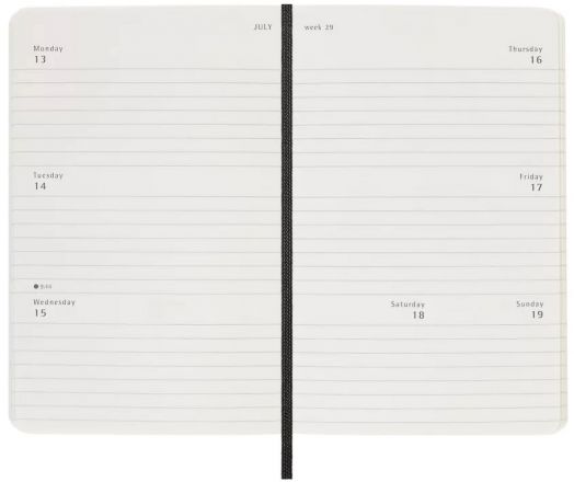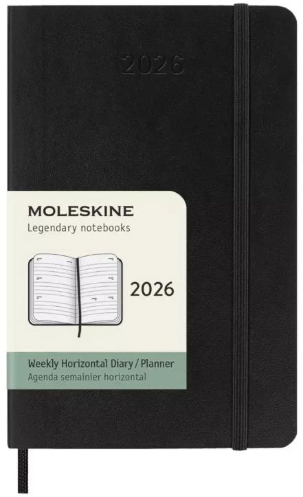 Джобен черен седмичен тефтер - органайзер Moleskine Black за 2026 година с меки корици и удобна и еластична лента, която да защитава бележките ви.