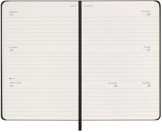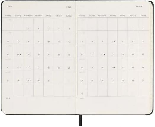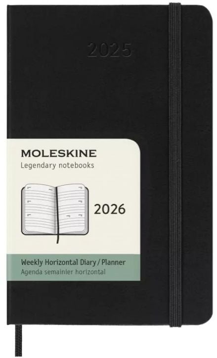 Джобен черен седмичен тефтер - органайзер Moleskine Black за 2026 година с твърди корици и удобна и еластична лента, която да защитава бележките ви.