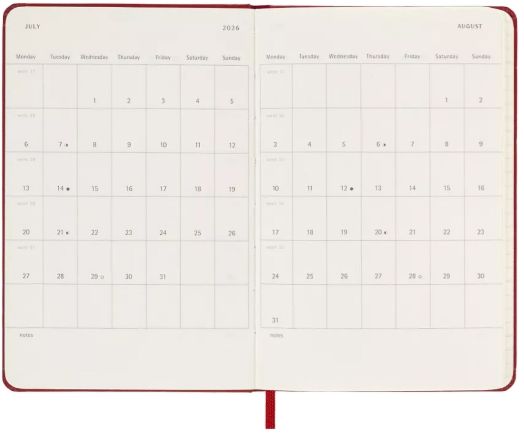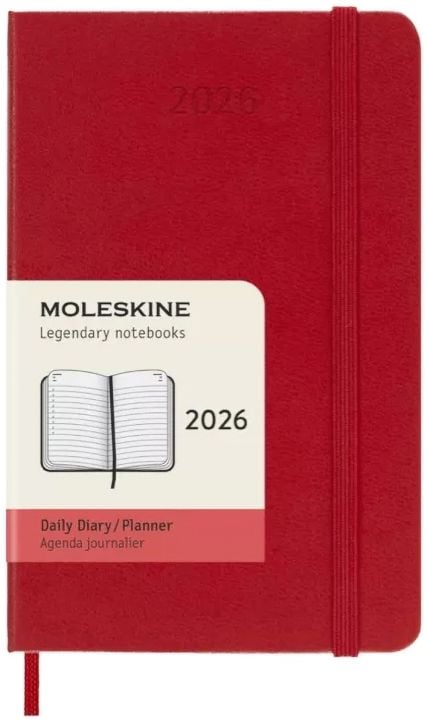 Джобен червен ежедневен тефтер - органайзер Moleskine Scarlet Red за 2026 година с твърди корици в удобен формат 9 х 14 см.