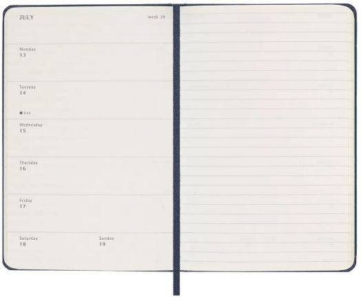 Организирането на дните от седмицата е на лявата страница в хоризонтален изглед, а дясна страница е линирана - с широки редове, което я прави подходяща за бележки и коментари.