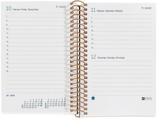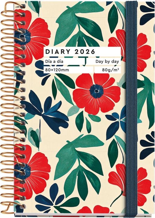 Джобен бележник - органайзер Miquelrius Natura Anémona за 2026 година със спирала и годишно планиране — един ден на страница (събота и неделя делят една страница).