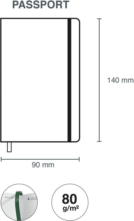 Вътрешен джоб за бележки, еластична примка за пишещи средства, страници за лична информация, 2-годишен календар, допълнителни листа за бележки и адреси / телефони.