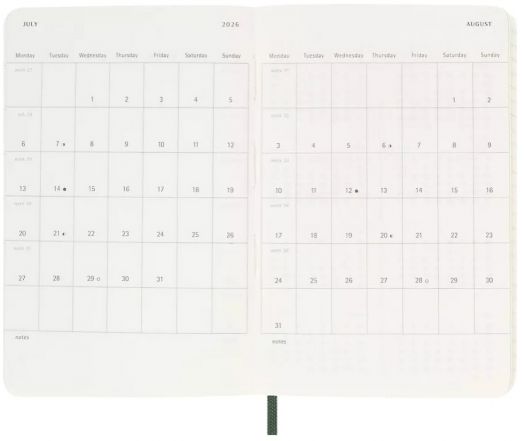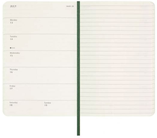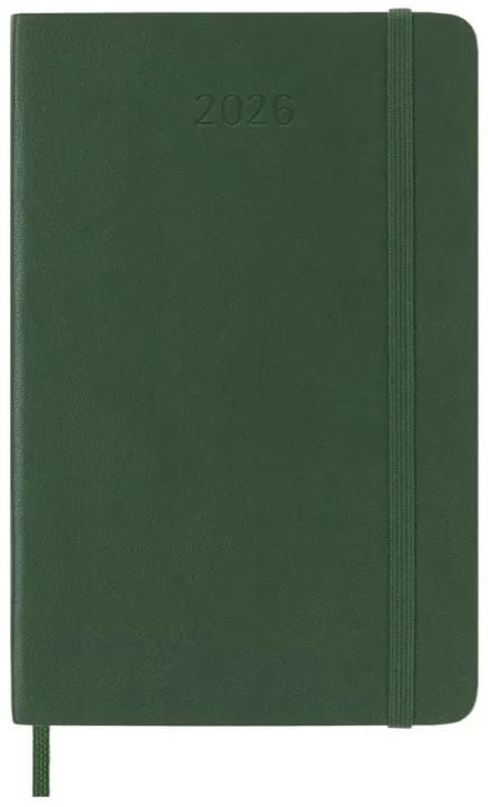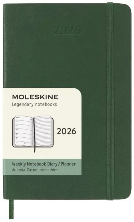 Джобен зелен седмичен тефтер - органайзер Moleskine Myrtle Green за 2026 година с меки корици.