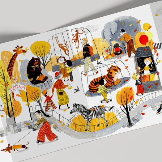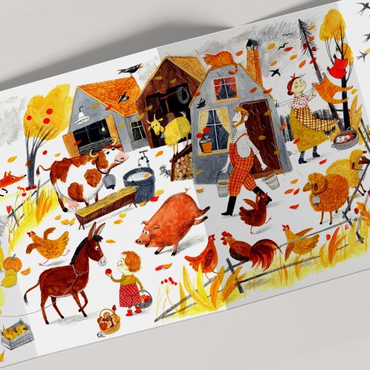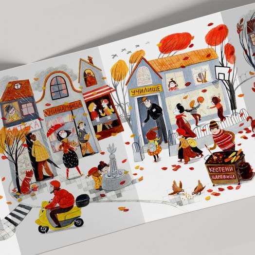 Есенна „от глава до пети“ е и първата ни тиха книжка тип хармоника от нова поредица за сезоните. В нея се стеле разкошът на есента – чудна и витална, в златни багри. Нарисува Елена Жаблянова.