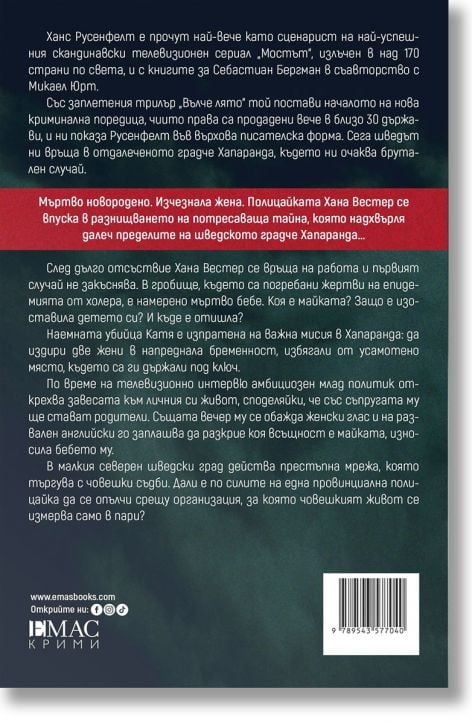 Мъртво новородено. Изчезнала жена. Полицайката Хана Вестер се впуска в разнищването на потресаваща тайна, която надхвърля далеч пределите на шведското градче Хапаранда…