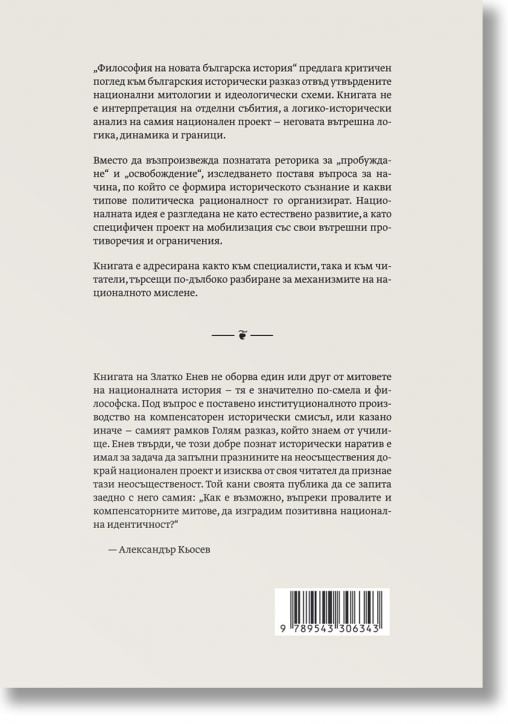 „Философия на новата българска история“ предлага критичен и концептуален прочит на българския исторически разказ, който се отдалечава от утвърдените национални митологии и от традиционните форми на историографско писане. Книгата не реконструира събития, а изследва логиката, която ги свързва, повтаря и трансформира във времето. Нейният фокус е не върху това „какво се е случило“, а върху начина, по който историята е мислена, организирана и използвана като инструмент за легитимация и идентичност.