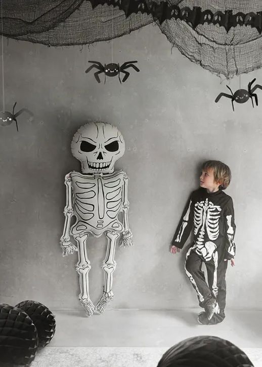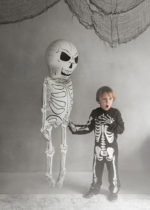 Добавете щипка забавление и стил към вашето Halloween парти или тематично събитие с този впечатляващ фолиев балон във форма на скелет! Балонът комбинира елегантни кремави и черни тонове, които му придават ефектен вид.