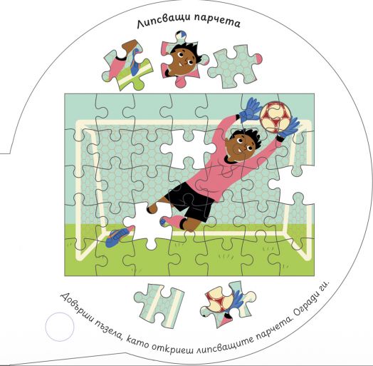 Със своята атрактивна кръгла форма и включени стикери, книгата грабва вниманието още от пръв поглед и го задържа с разнообразие от весели задачи. Вътре те очакват 74 страници, изпълнени с футболни пъзели, игри за откриване на разлики, логически загадки и предизвикателства с топки и голмайстори.