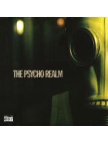 Размазано изображение с газова маска в близък план, надпис "THE PSYCHO REALM" в центъра и етикет със съвети за родители загатват за ъндърграунд рап атмосферата на The Psycho Realm - The Psycho Realm (2 VINYL) в тъмнозелен цвят.