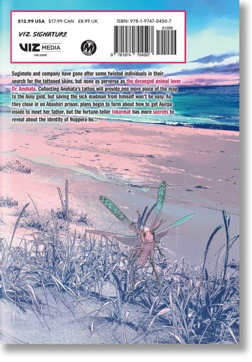Sugimoto and company have gone after some twisted individuals in their search for the tattooed skins, but none as perverse as the deranged animal lover Dr. Anehata. Collecting Anehata’s tattoo will provide one more piece of the map to the Ainu gold, but saving the sick madman from himself won’t be easy. As they close in on Abashiri prison, plans begin to form about how to get Asirpa inside to meet her father, but the fortune-teller Inkarmat has more secrets to reveal about the identity of Noppera-bo...