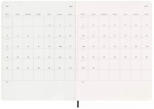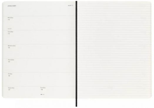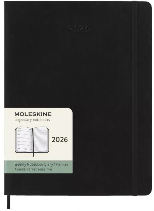 Голям черен седмичен тефтер - органайзер Moleskine Black за 2026 година с меки корици.