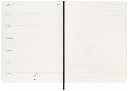 Организирането на дните от седмицата е на лявата страница в хоризонтален изглед, а дясна страница е линирана - с широки редове, което я прави подходяща за бележки и коментари.