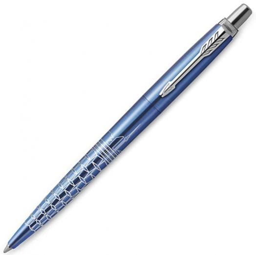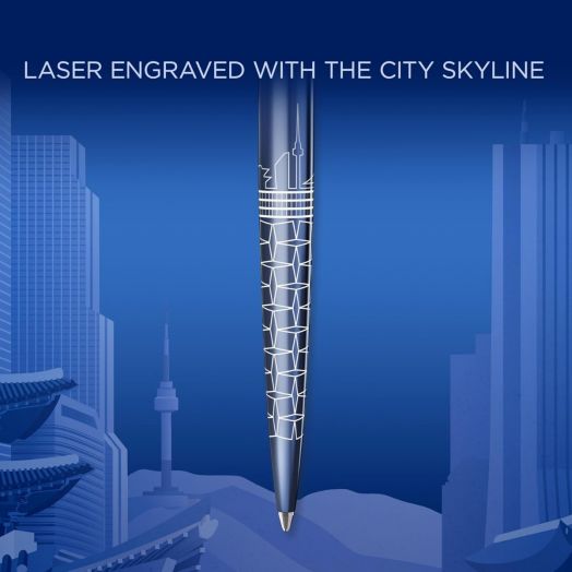 Фино гравираният силует на града и индиговото лакирано покритие са пример за майсторството на Parker, което придава на Jotter изискана визия, характерна за луксозните пишещи инструменти.