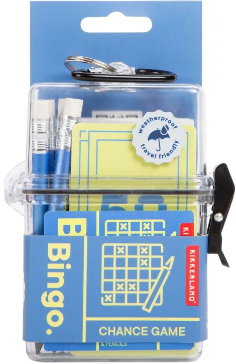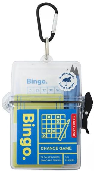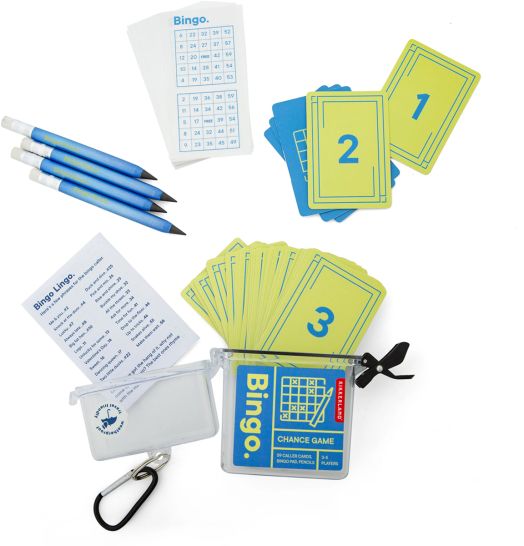 Включва 59 карти за теглене, 50 бинго листа, 4 вечни молива и инструкции — всичко това опаковано във водоустойчив калъф с карабинер за ключодържател, който можете да закачите към всяка чанта или презрамка.