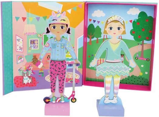 Магнитен комплект с игра за преобличане Floss & Rock „Dress Up Best Friends“, включващ 2 магнитни кукли, които обожават да приключенстват заедно и имат над 70 магнитни дрехи и аксесоари за безкрайни комбинации.