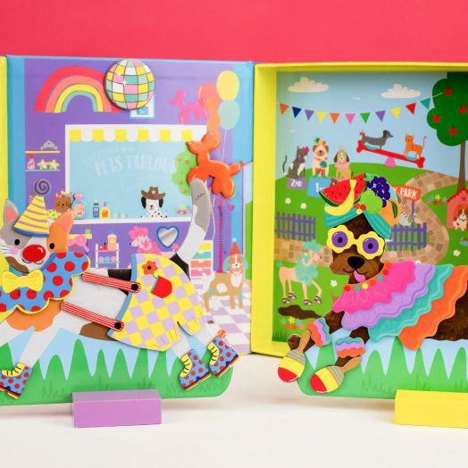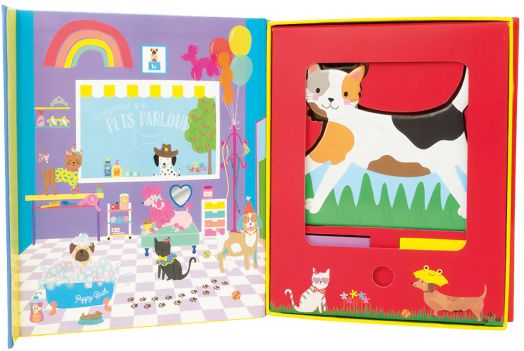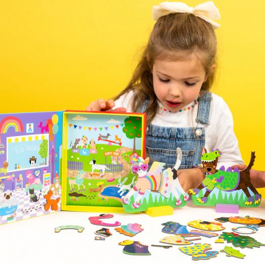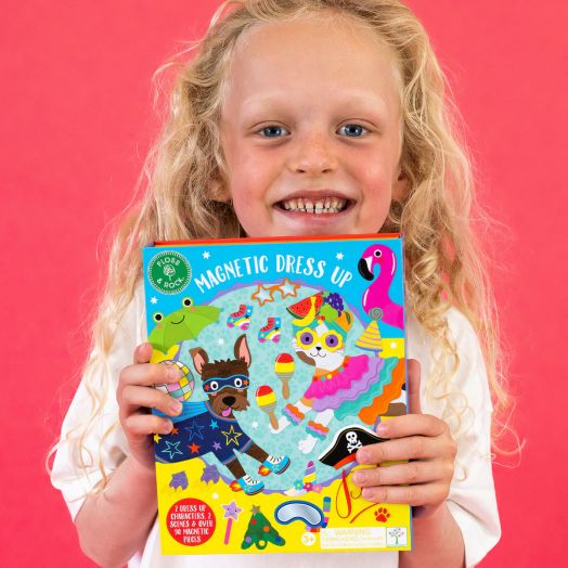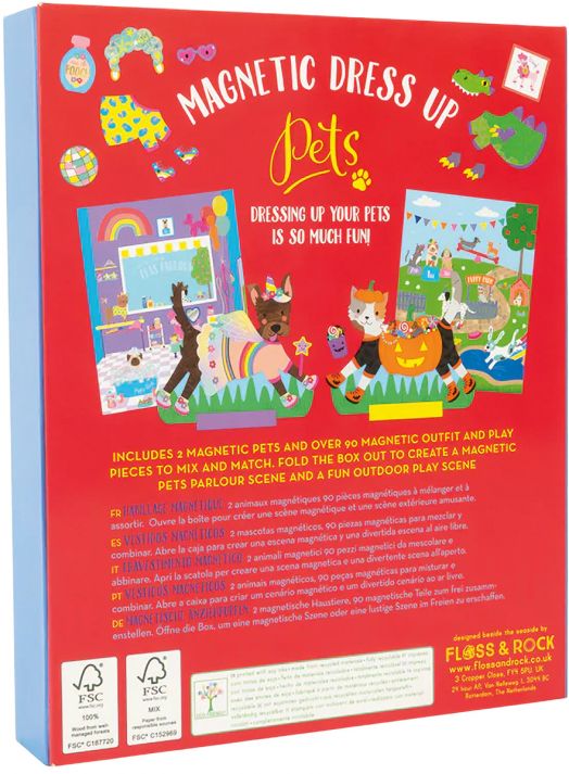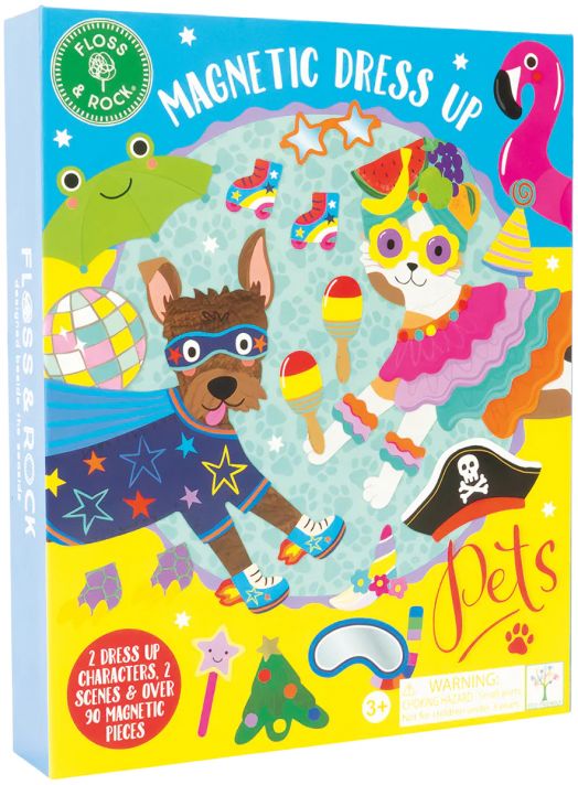 Магнитен комплект с игра за преобличане Floss & Rock „Dress Up Pets“, включващ две магнитни животинки – игриво кученце и супер сладка котка, които обожават да приключенстват заедно и имат над 90 магнитни дрехи и аксесоари за безкрайни комбинации.