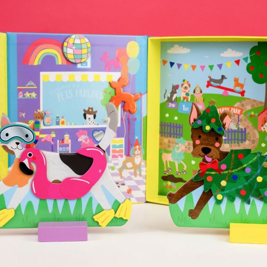 Красивата многократна кутия със магнитно закопчаване се превръща във фон за игра, с „пет салон“ от едната страна и забавна сцена на открито от другата.