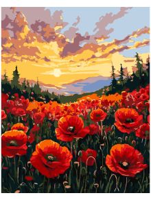 Наситено поле от червени макове по залез с драматични облаци и силуети на борове - Идеален за Комплект за лесно рисуване с акрилни бои Ideyka - Поле с макове, 40 x 50 см.