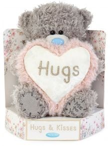 Плюшено мече Me To You - Hugs, 15 см е сиво мече със син нос, което държи бяла възглавничка с форма на сърце и надпис "Hugs". Тя се предлага в украсена кутия с надпис "Hugs & Kisses" - идеален подарък!.